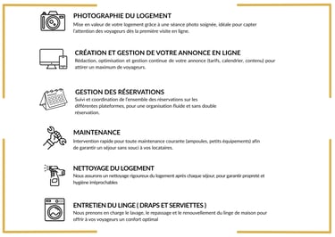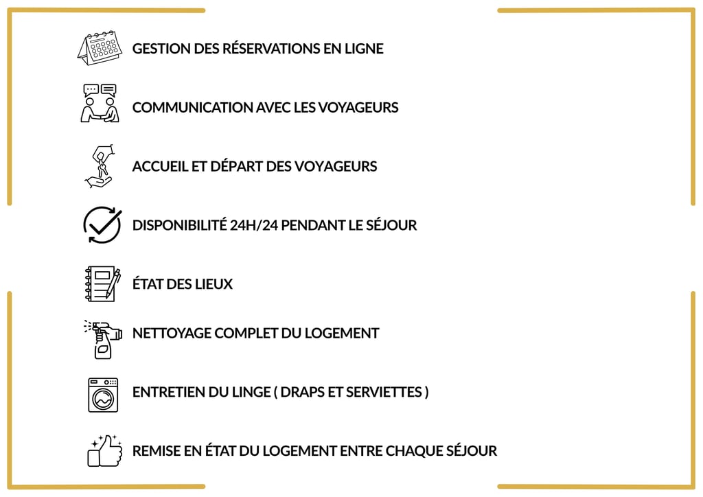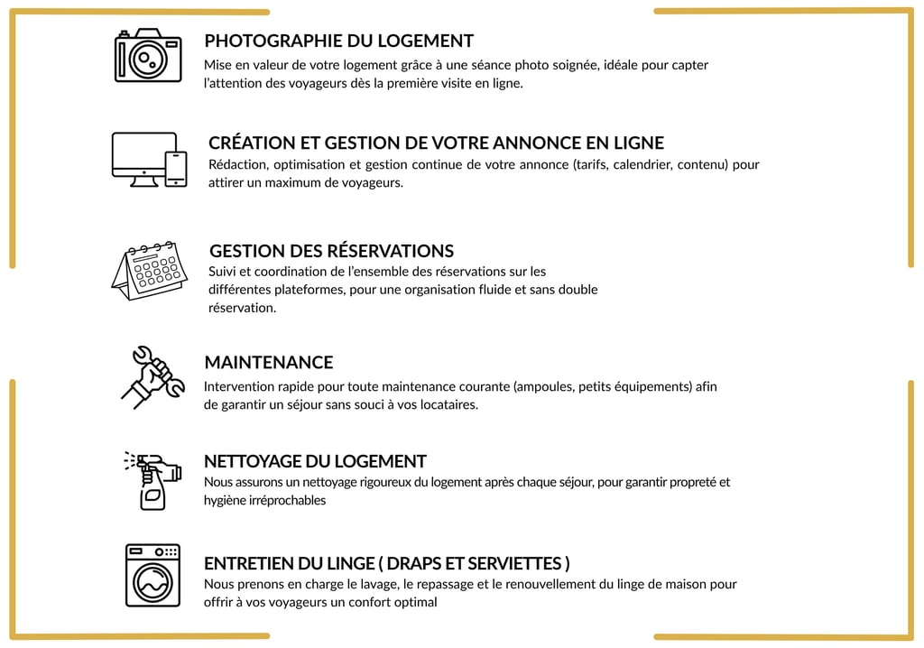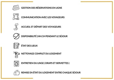 gestion des réservations , communication avec les voyageurs , accueil et départ des voyageurs , disponibilité 24h/24 durant le séjour , état des lieux , nettoyage complet du logement , entretien du linge , remise en état du bien entre chaque séjour , photographie du logement , création et gestion de votre annonce en ligne , gestion des réservations , maintenance , nettoyage du logement , entretien du linge ( draps et serviettes )