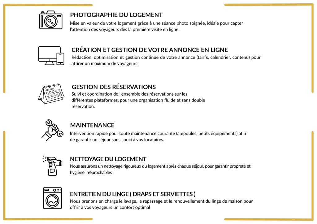 Nous vous proposons un service de gestion tout-en-un de votre logement, incluant toutes les prestations nécessaires pour garantir une expérience de qualité, sereine et sans contrainte.